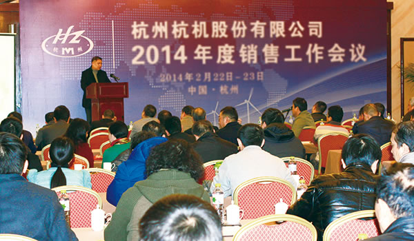 杭機(ji)股份2014年度銷售工(gōng)作會議于12月12日—23日(ri)在杭州藍天🙇♀️清水(shuǐ)❄️灣國際大酒店舉(ju)行,來自全國各地(dì)的五十多家經銷(xiao)公司的近80名代表(biao)參加了會議。