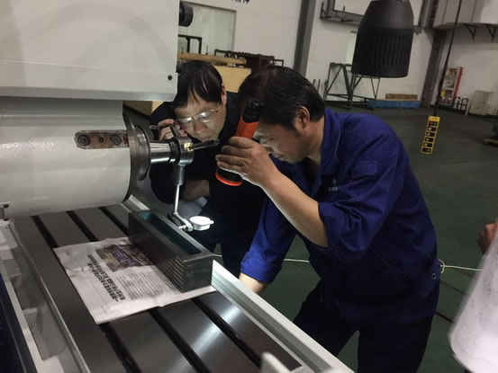 圖爲專(zhuan)家在杭機股份(fèn)現場抽查M7132H卧軸(zhou)矩台平面磨床(chuang)的🐆幾何精度
